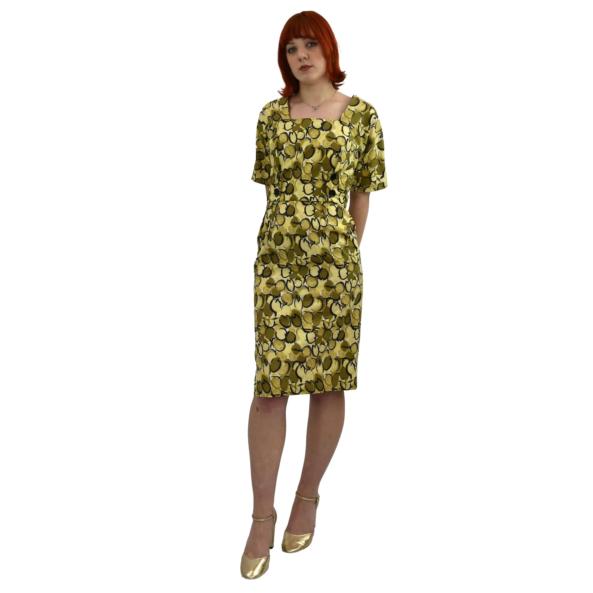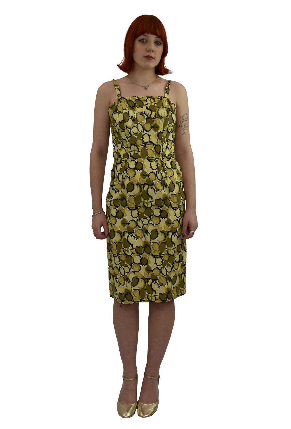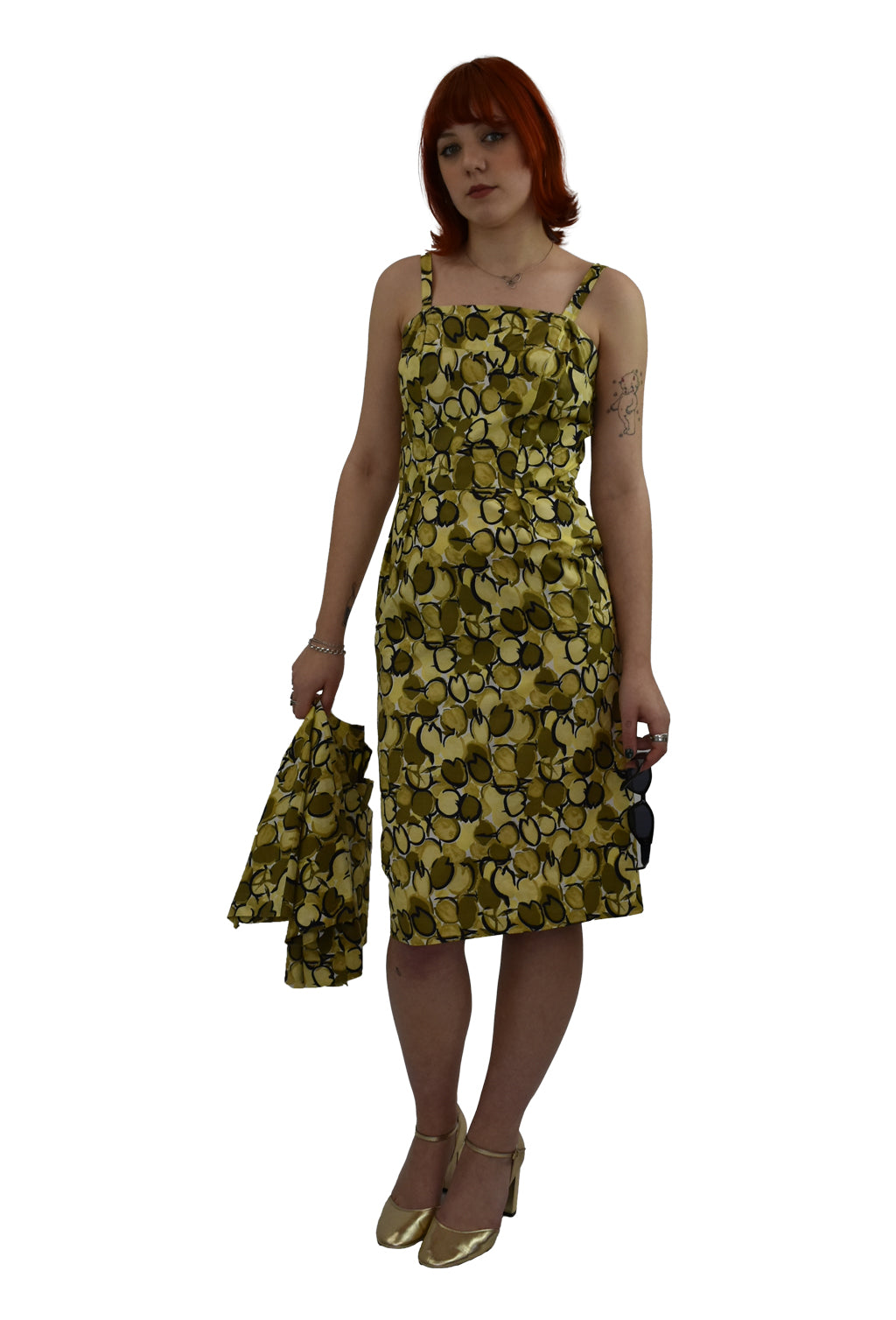 Beautiful Horrockses two piece, yellow and khaki abstract botanical print, pencil fit shift skirt, square neck dress, cropped button up over-top/jacket.