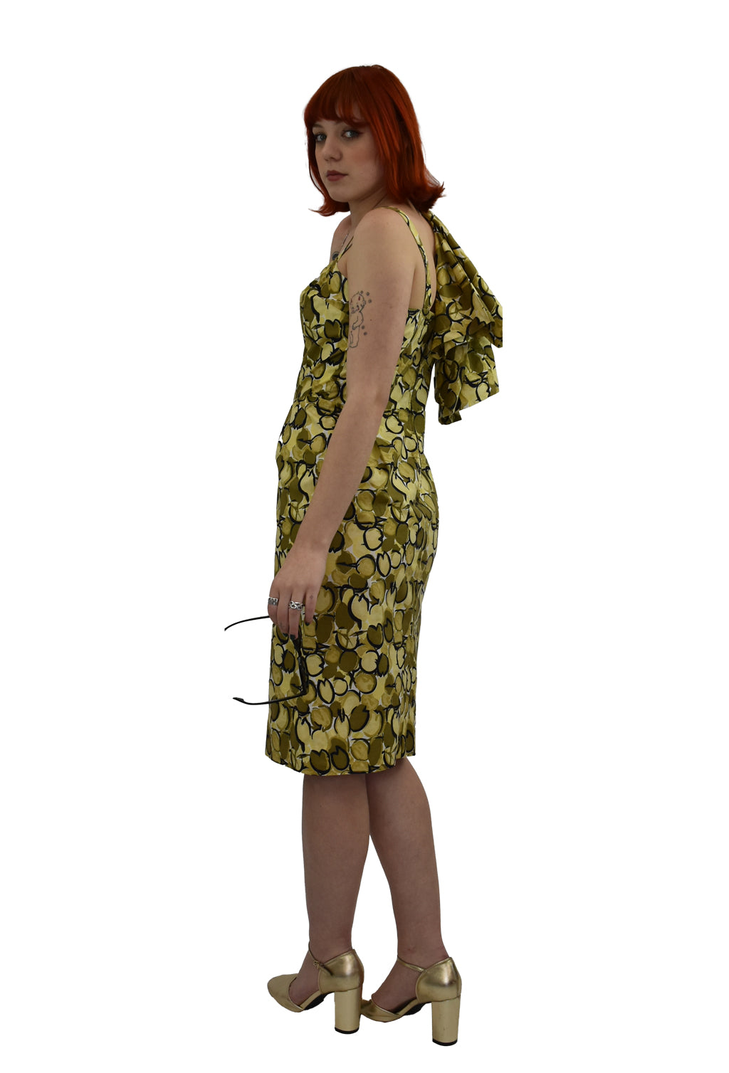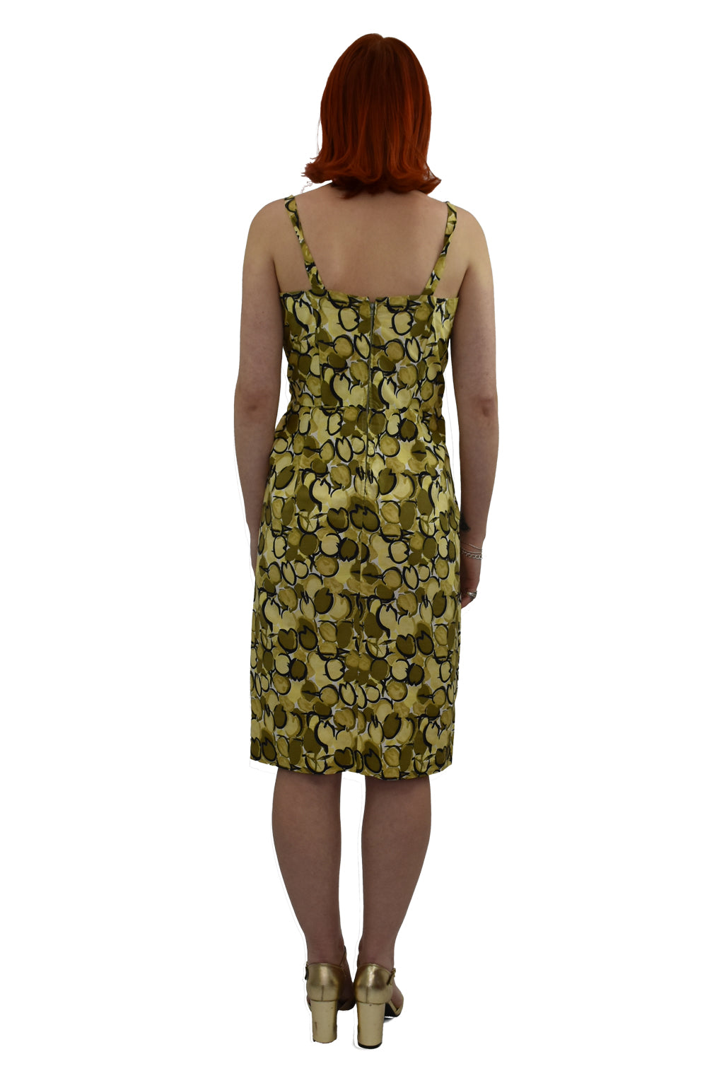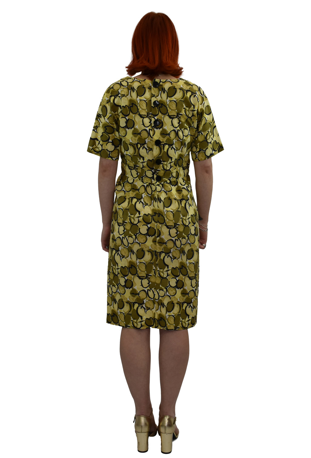 Beautiful Horrockses two piece, yellow and khaki abstract botanical print, pencil fit shift skirt, square neck dress, cropped button up over-top/jacket.