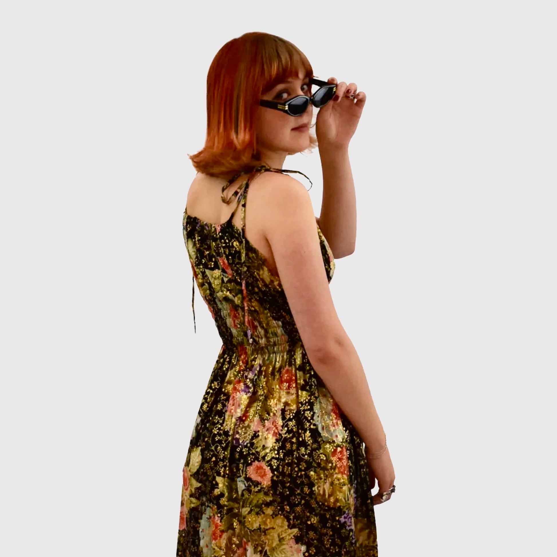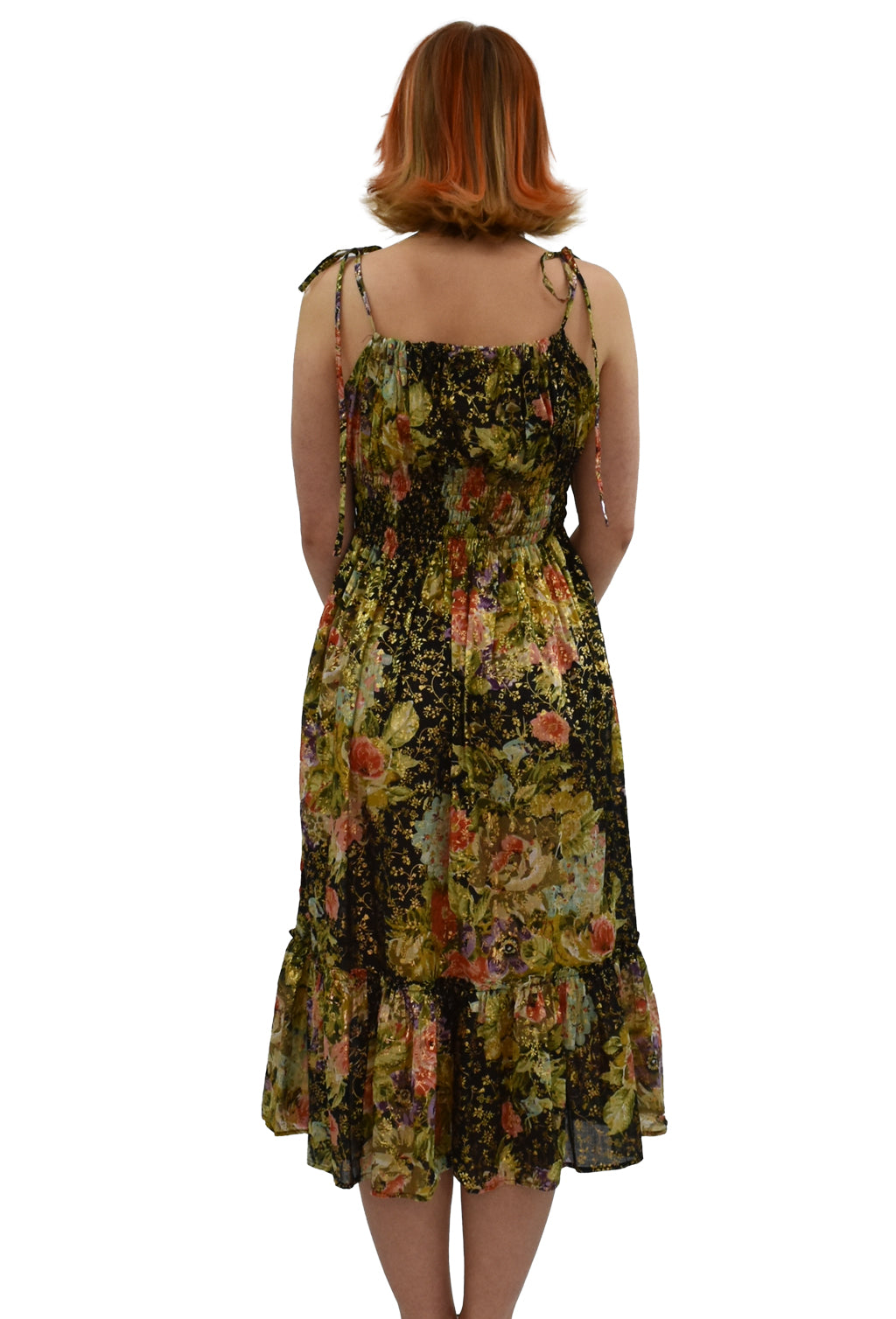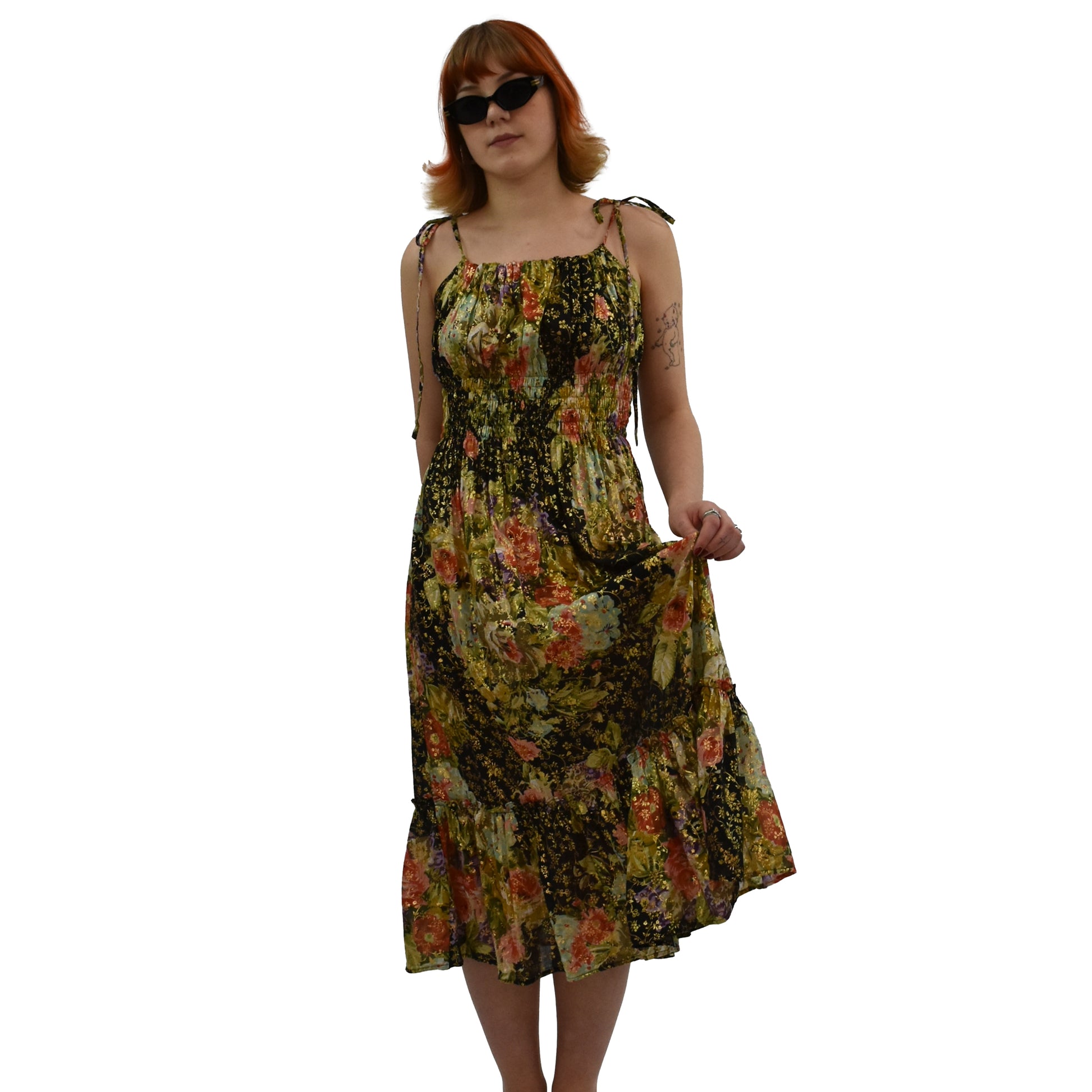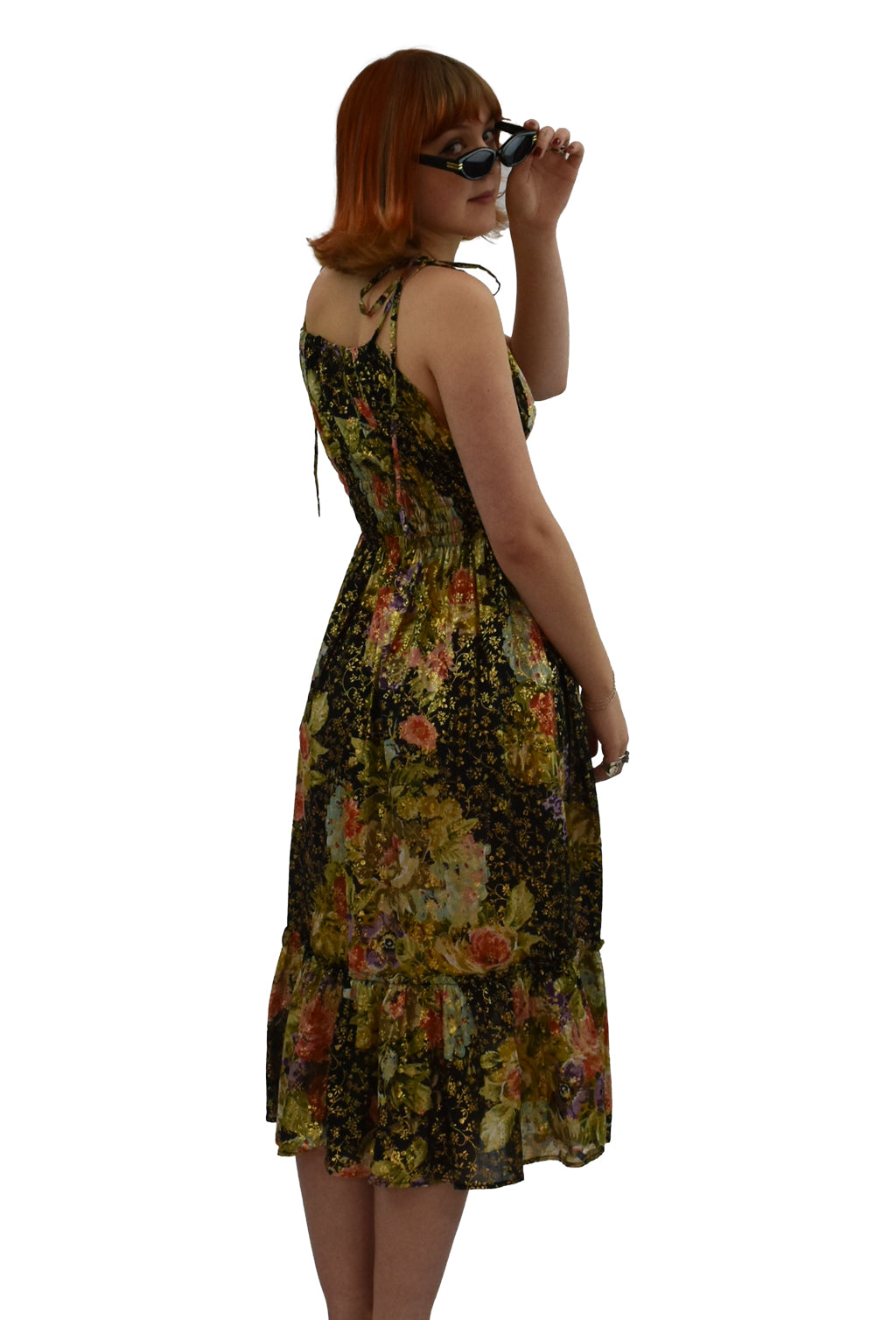 Gorgeous bohemian dress, in black with a multi floral print. The addition of gold to the print just adds that something extra. Ruffle hem, shirred waist and tie straps. Perfect for summer holidays and occasions.